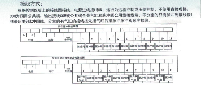 控制儀采用大規(guī)模集成電路搭建而成,采用六位數(shù)碼管顯示,_加直觀。兩個(gè)電位器按鍵設(shè)置參數(shù)或四個(gè)按鍵設(shè)置參數(shù),使用只有脈沖閥的除塵器上。
