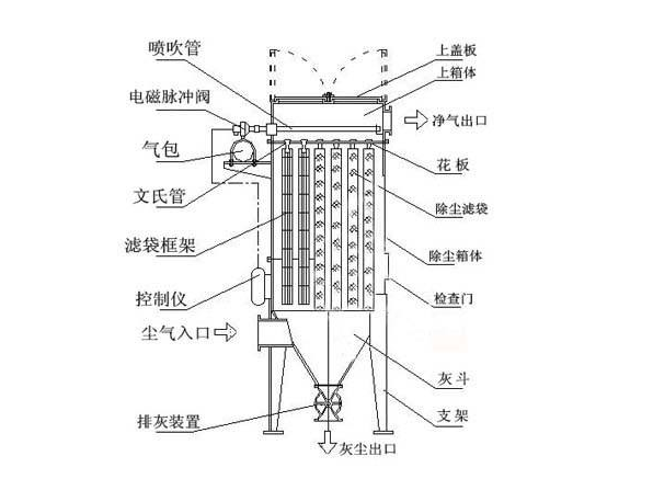 單機布袋脈沖除塵器分為五部分: 上箱體:由可掀起的蓋板和出風口組成。 中箱體:由多孔板、濾袋裝置和文氏管組成。 下箱體:由進風口、灰斗和檢查門組成。 排灰系統(tǒng):由減速裝置和輸灰、排灰裝置組成。 噴吹系統(tǒng):由控制儀、控制閥、脈沖閥、噴吹管、氣包和防護裝置組成。