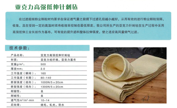 滌綸針刺過濾氈:具有普通氈類濾布有的空隙空高、透氣性好、集塵效率高、使用壽命長等優(yōu)點(diǎn)。其耐溫等級適中,瞬間可達(dá)150℃,耐酸、耐堿適中,而且具有非常好的耐磨性。